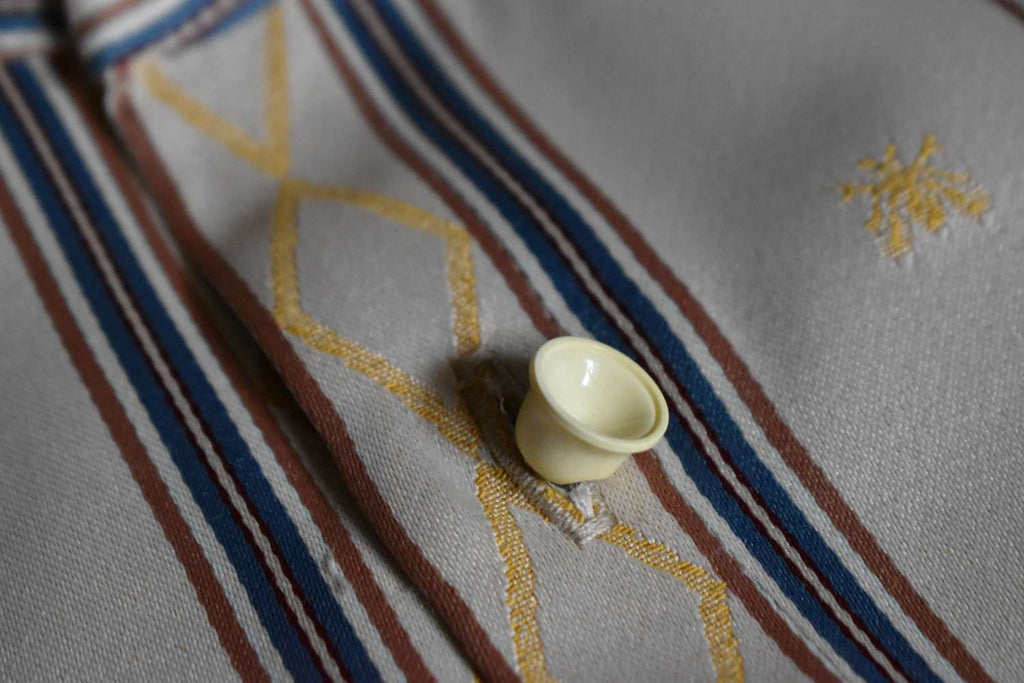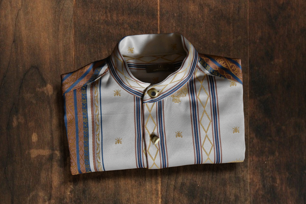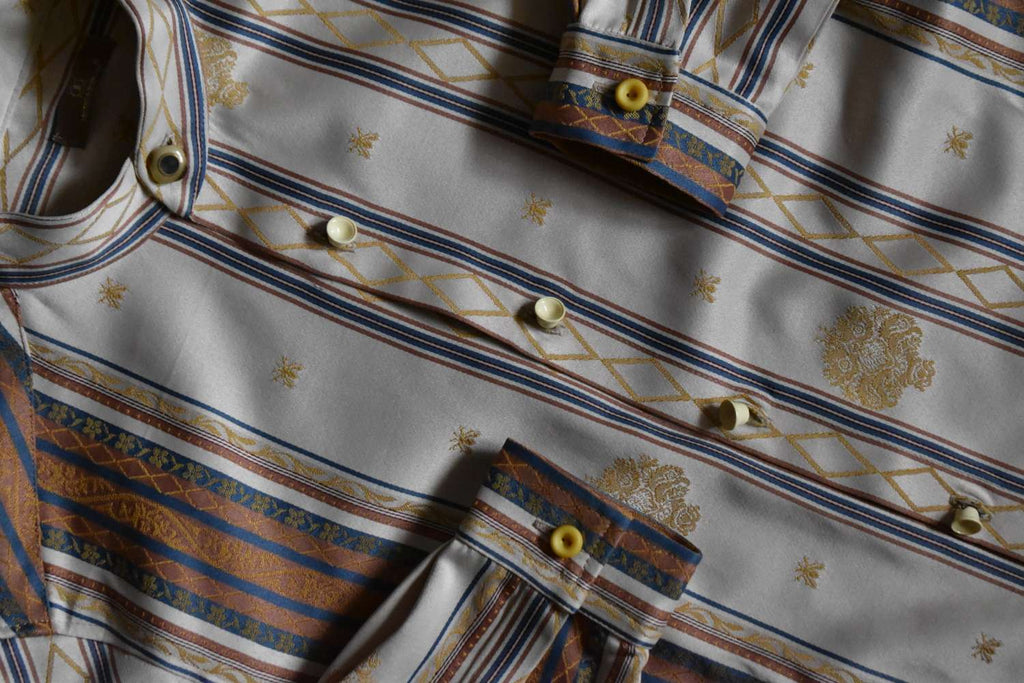 La camicia n°1100 celebrata con un pezzo unico incredibile. Pregiato raso ricamato di arredo vintage con fantasia classica a trama verticale. Dettagli davvero unici, l'oro ripreso in bottoni vintage ai polsi, una meraviglia in madreperla nel colletto e bottoni a campana anni '70 lungo tutta l'opera.